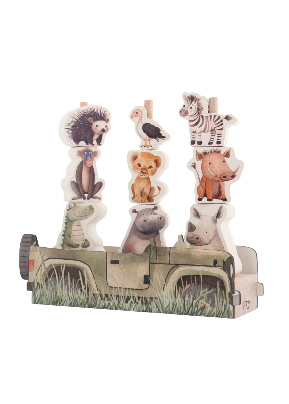 The Safari vehicle inspired stand creates the feel of being in the African landscape with all the animals playing with each other as they take the journey through the bush.