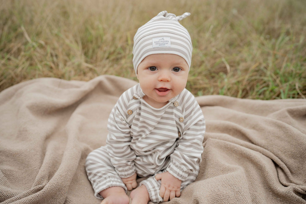 A soft and stylish essential for newborns, our knotted hat in Stone Stripe is designed to keep little heads and ears warm. Made from a breathable, stretchy cotton blend, it offers a snug fit and features an adjustable top knot to grow with your baby. The subtle stone-coloured stripe adds a classic, unisex touch — perfect for gifting or everyday wear.